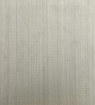微孔吸音板,其(qí)從上到下依次包含表(biǎo)層,基層,基(jī)層上(shàng)開有(yǒu)若幹圓形(xíng)通孔,表層上(shàng)緊密(mì)分布有微小圓孔,表層(céng)上的落在所述(shù)圓形通孔的外輪廓範圍內的超微孔與相應的圓形通孔連通。